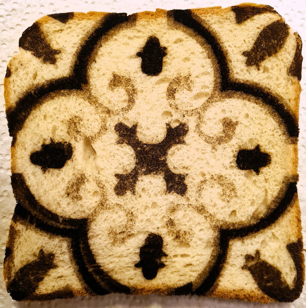 Concrete (« béton » en anglais) pour les carreaux de ciment que l’on imagine inusables et qui sont ici incarnés par la base la plus humble de notre alimentation, éphémère, fragile et néanmoins essentielle. Subtile dans la réalisation des volutes qui ne sont qu’un état particulier de la mie de pain localement et délicatement grillée.